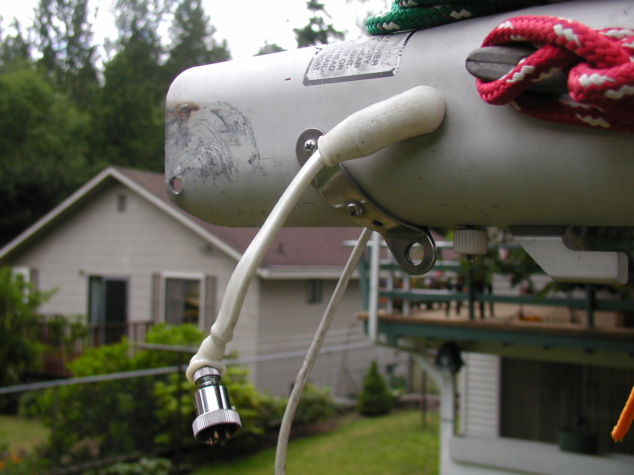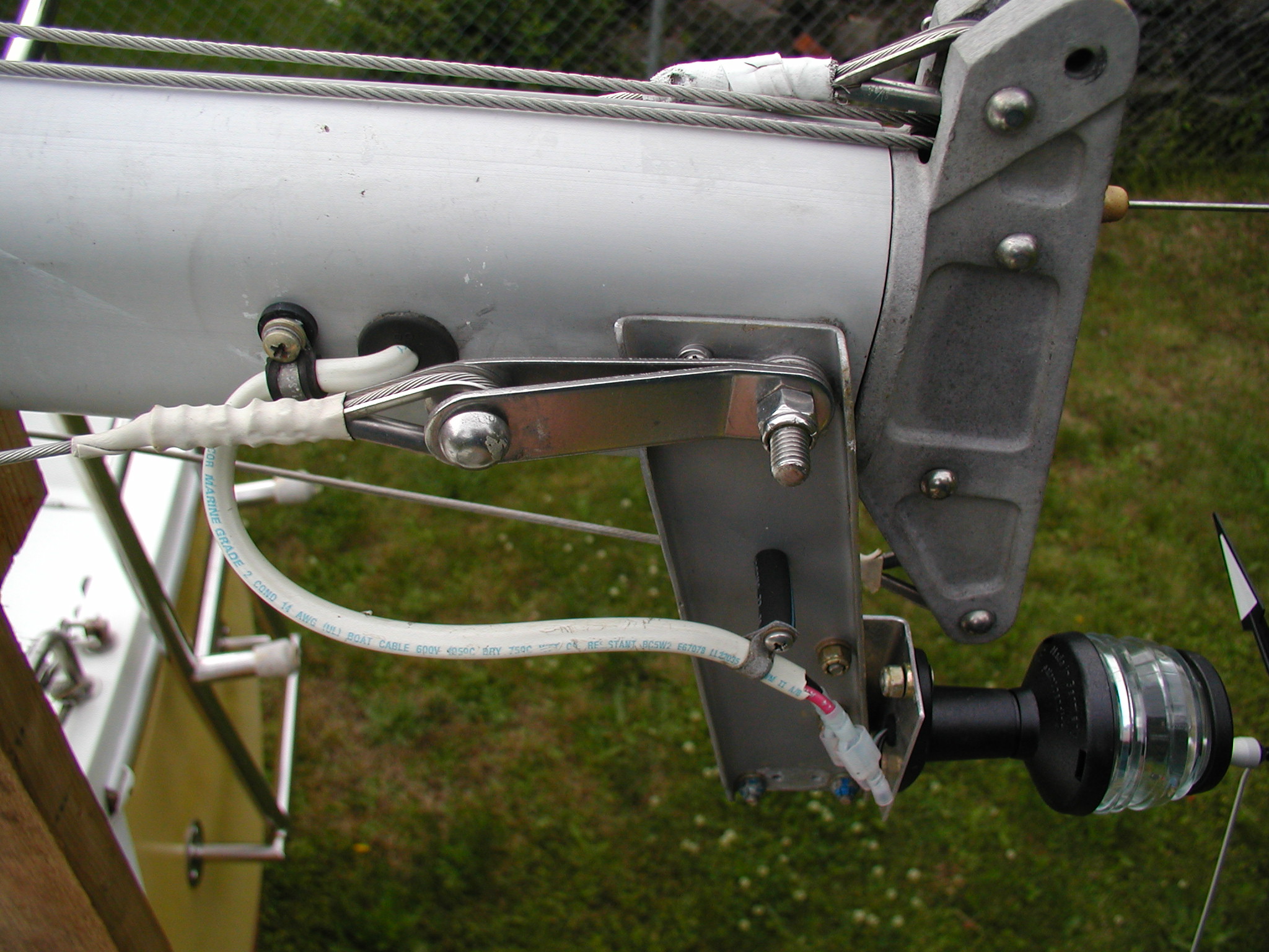 hardware designed for engine compartment connections. The 4-conductor pigtail is only about 2 1/2 feet long. It is left over 14 AWG tinned marine-grade stock from my autopilot installation. The rest of the new portion of the harness is 16 AWG of the same spec (I retained the stock two-conductor harness for the steaming light). The harness was built up on the floor of the garage and tied up with waxed rib-lacing; another hold-over from airplane mechanicing. I tossed out the open-cell foam-rubber plugs that were taped to the stock harness and instead drove lengths of closed-cell plumbing insulation into the mast cavity - et voila; no internal mast slapping. |