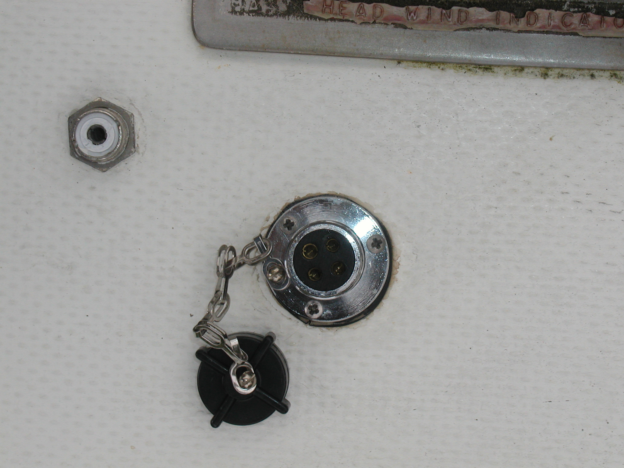 | I wanted to keep my switches in the cabin, out of the weather, and all on one place, so I rewired the thru-deck harness from 2 to 4 conductors. I replaced the deteriorated and failing stock 2-conductor fitting with a West Marine 4-conductor assembly; about $14.00. |