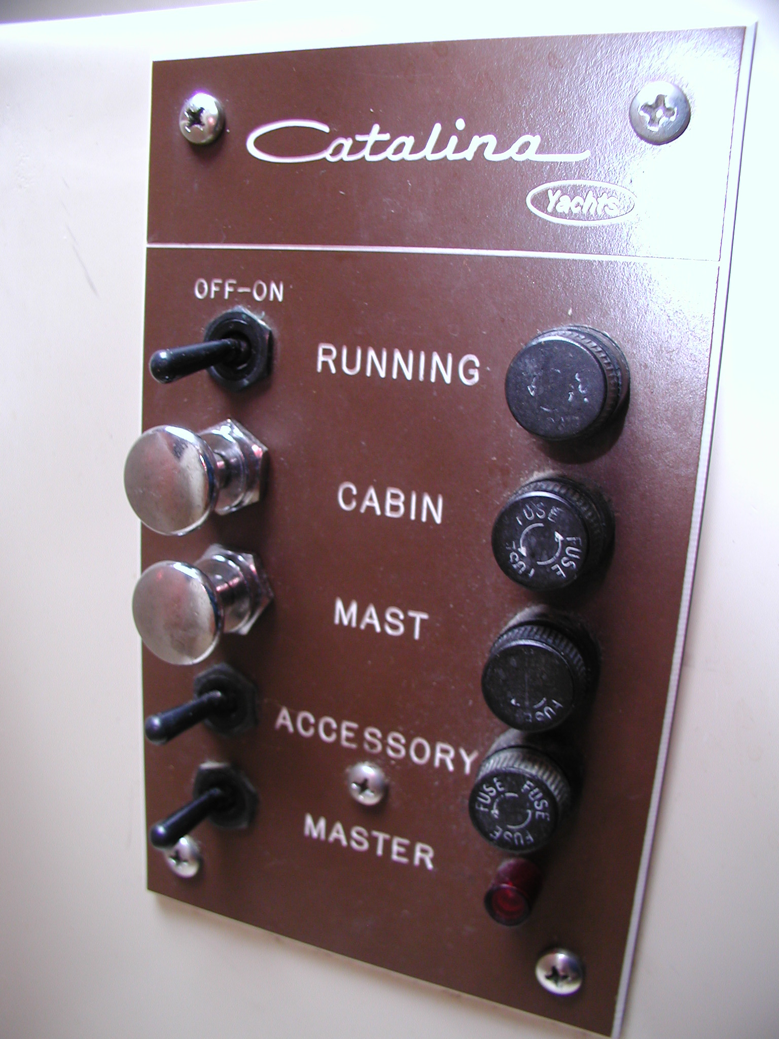 The cabin toggle was replaced with an <off - on A - on A&B> pull-switch. This is wired to the cabin lights (A) and the deck light (B). $14.00 at West Marine The mast light toggle was replaced with an <off - on A - on B> pull-switch. This is wired to the steaming light (A) and anchor light (B); they can't (and shouldn't) be on at the same time. $13.00 for this switch at West Marine Why not use center-off 3-position toggles? I thought these looked cooler and I like the way they feel. |