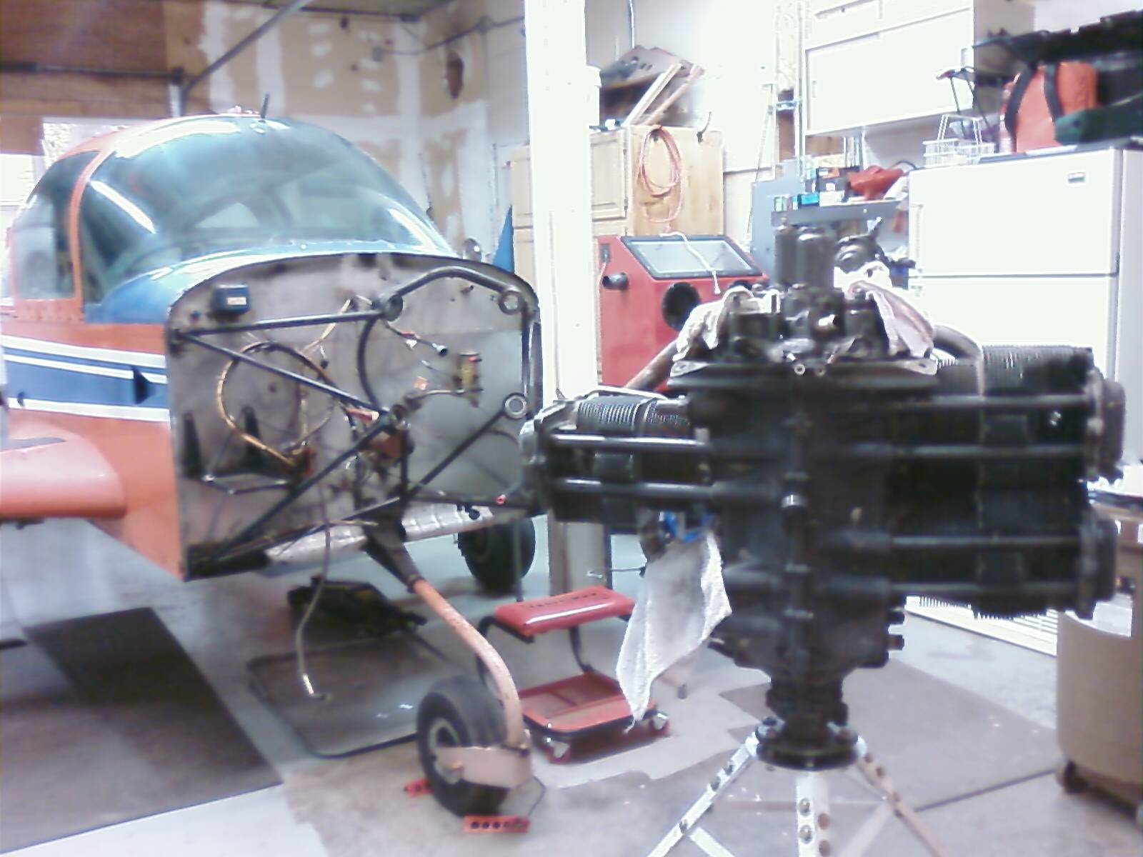 14L's O-320-E2G bolted to it and standing up on its prop flange.