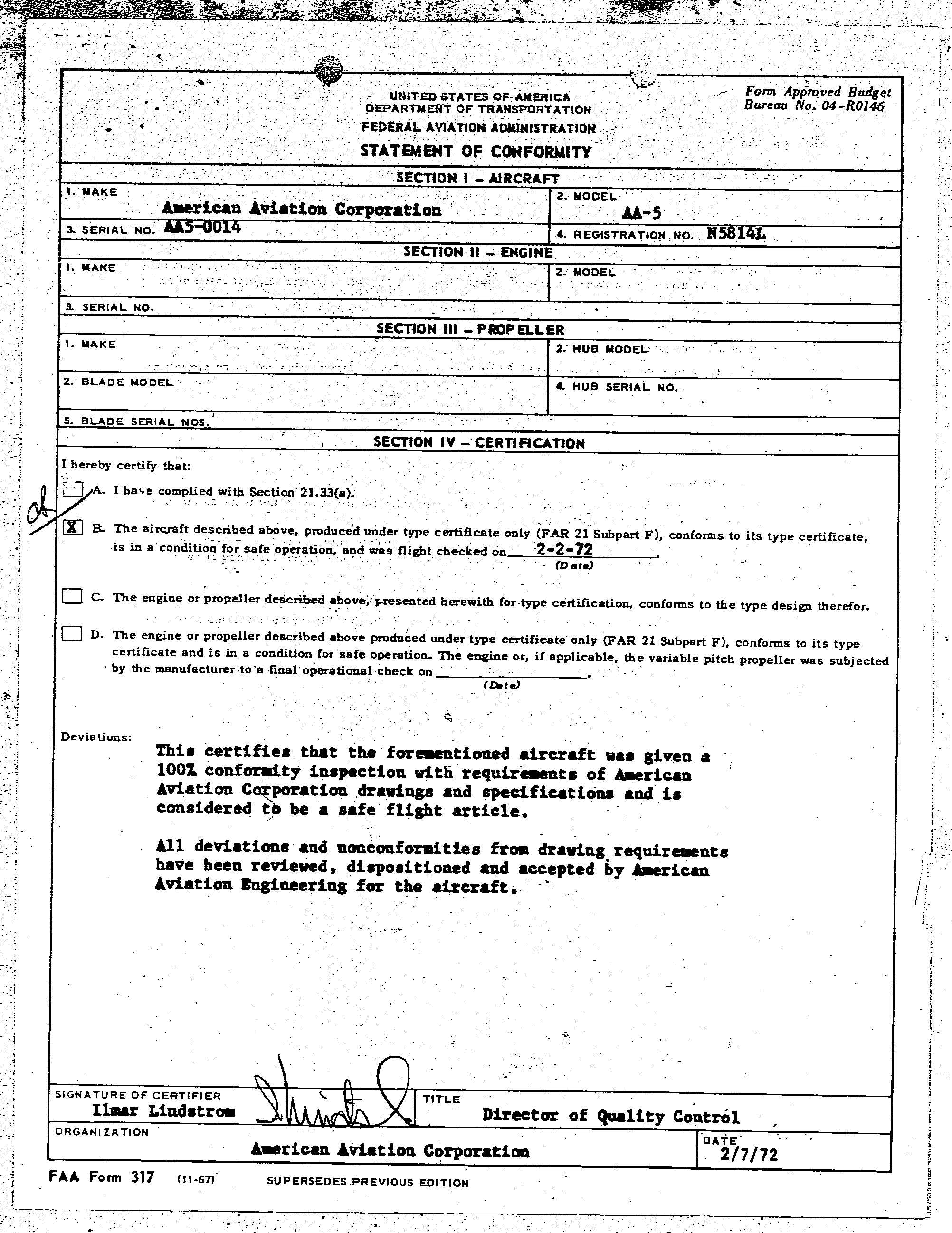Production and FAA flight checks completed February 2, 1972 and conformity
