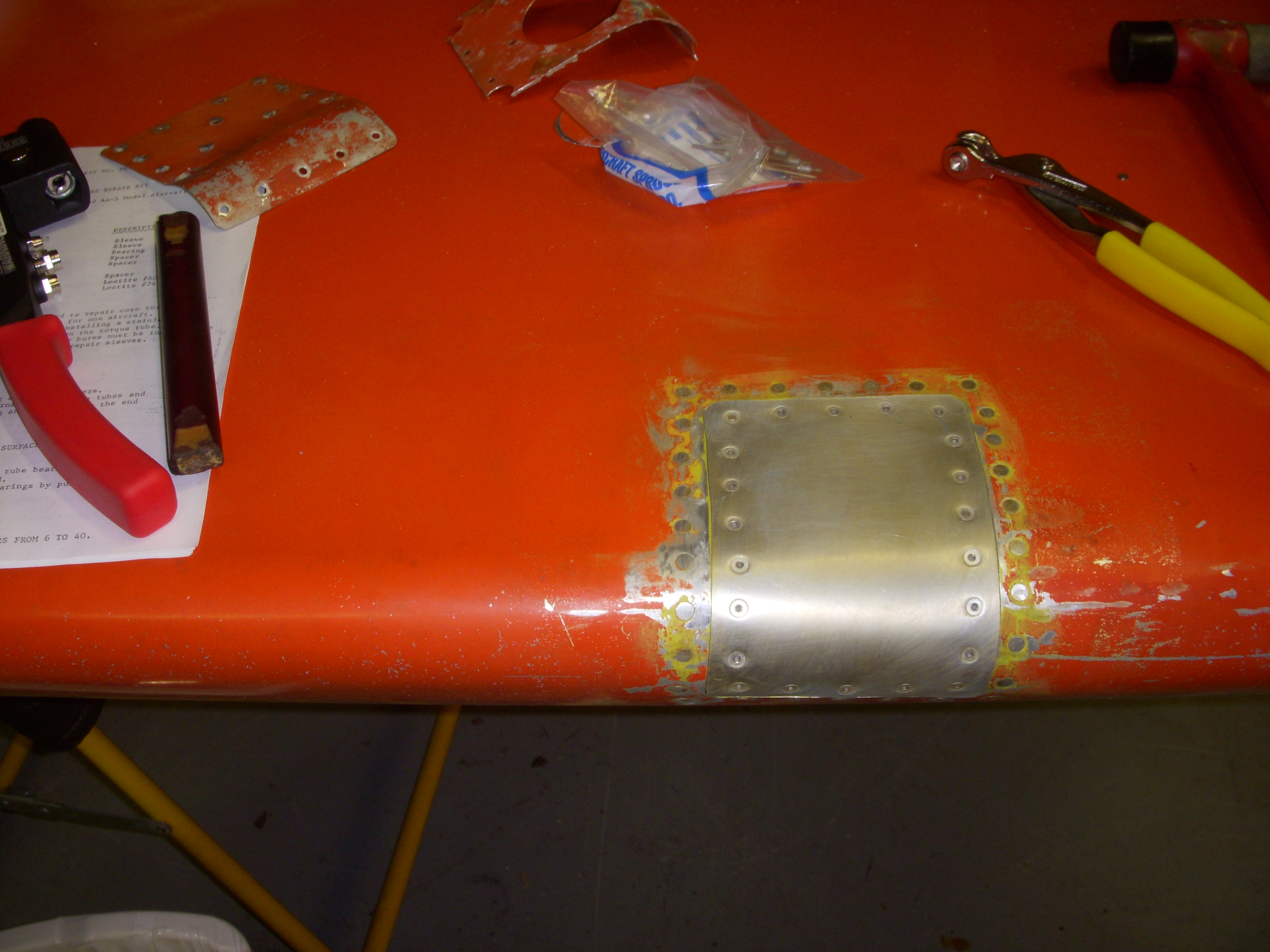 epoxy; bare aluminum on the original still-painter substrate. The rivet layout neither conforms to AC 43-13 1B nor chapter 20 of the AA-5 maintenance